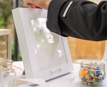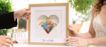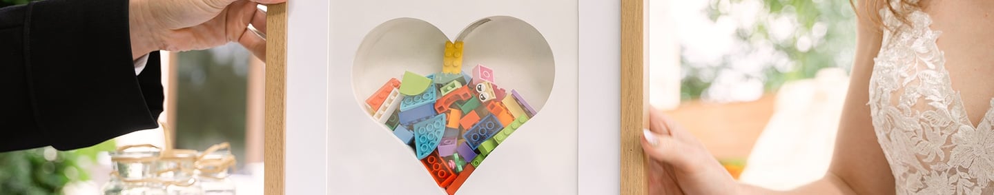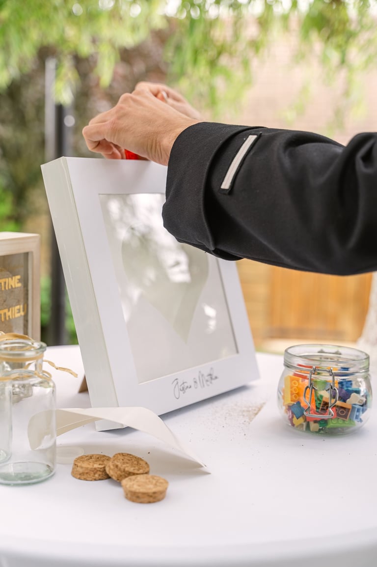 La symbolique : Garder un souvenir précieux de ce jour en impliquant les invités. Suivant la taille du cadre, on peut y glisser ce que l'on souhaite (ronds en bois, papiers, legos comme mes mariés...) Un souvenir symbolique et esthétique à garder pour toute la vie.