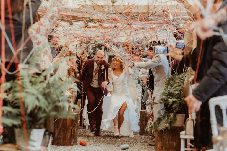 Le principe : Généralement en fin de cérémonie. On envoie les pelotes de chaque côté de l'allée et on l'enroule autour de poignet, et ainsi de suite jusqu'à tisser une grande toile. Les mariés passent en dessous avec une musique festive !
